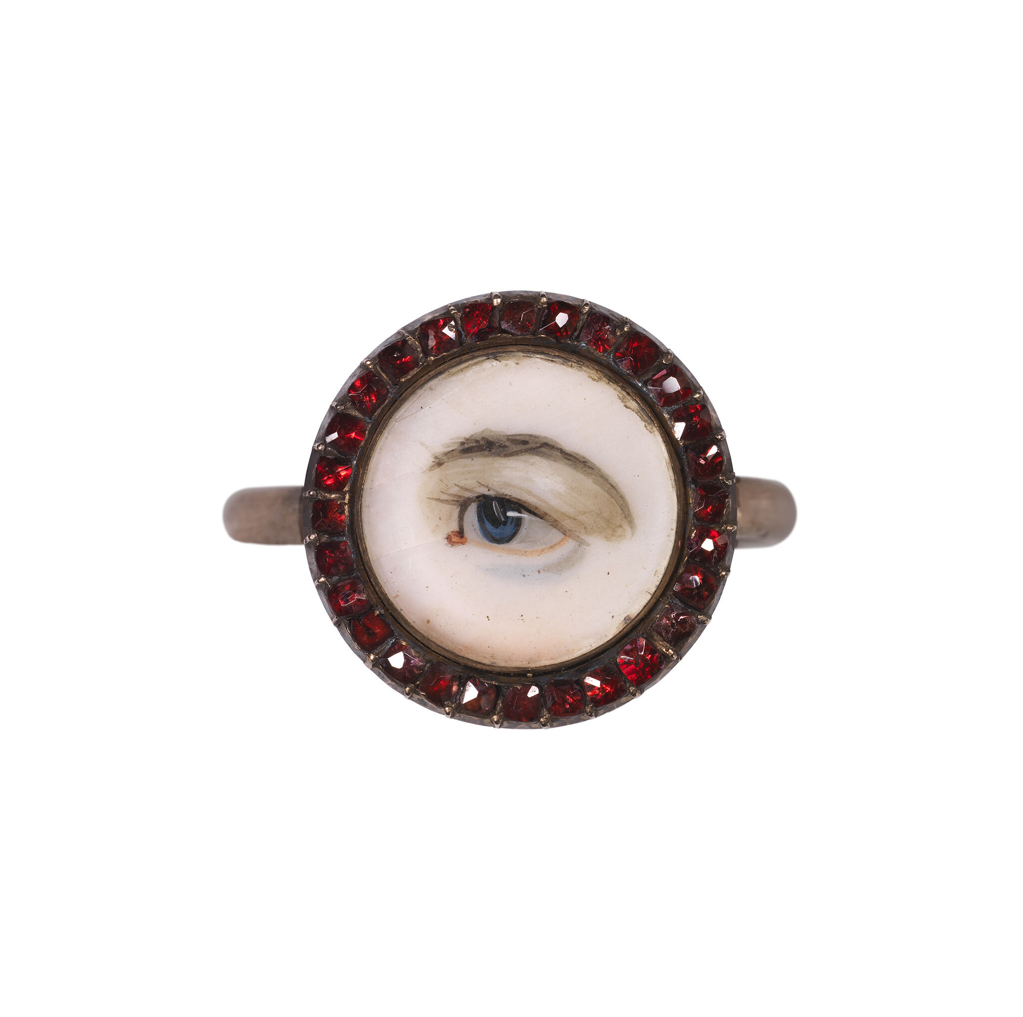Although we do not know the artist for this left-eye miniature and its pair (Fig. 1, F58-60/198), they were painted by the same hand. A single beauty mark in the corner of one differentiates it from the other; beyond that, they appear virtually identical. Both are set in rings from the early 1800s with red cut-stone surrounds. Garnets were popular settings for lover’s eyes, called the “most desirable gemstone of Georgian day jewellery” due to its affordability, attractiveness, and association with felicity and friendship.1Charles Welsh, The Language, Sentiment, and Poetry of Precious Stones (New York: Platt and Peck, 1912), 10, 11, 58, 126; Ginny Redington Dawes and Olivia Collings, Georgian Jewellery 1714–1830 (Woodbridge: Antique Collectors Club, 2007), 120. The eyes also share the same sweeping eyebrow with textured marks of dark brown, as well as simplified lines comprising the black arc of the upper lid, a half circle outlining the inner tear duct, and an orange stripe to designate the lower lid’s waterline. The blue irises gleam, highlighted with added dashes of white. A hint of blush appears at the bottom edge of both miniatures, indicating a slight flush to the cheek. These colors combine to enliven these diminutive yet tender compositions.