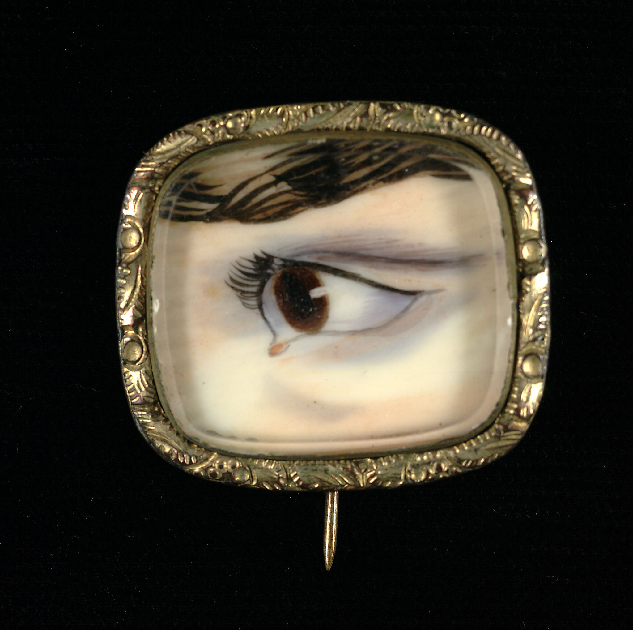 The most convincing evidence that the same artist painted both eye miniatures is a shared stroke of gum arabic: Derived from the sap of the African acacia tree, gum arabic was commonly used to bind watercolor pigments with water. In addition to its use as a binder, miniaturists capitalized on its glossy effect to create areas of highlight with larger quantities of gum. As with ivory, its availability benefited from trade routes that were expanding due to colonialism and the Atlantic slave trade. across the right edge of each pupil. A similar technique appears across the right edge of the pupil in a brooch at the Smithsonian American Art Museum, quite possibly linking all three eye miniatures (Fig. 2).2This argument is made by Elle Shushan in Lover’s Eyes: Eye Miniatures from the Skier Collection, ed. Elle Shushan (London: D. Giles Limited, 2021), 82, 84. The technique is modern; the eyes were painted in the early 1900s for a market already replete with eye miniatures.3According to a May 30-June 2, 2017 conversation with conservator Carol Aiken, notes in NAMA curatorial files. Graham Boettcher discusses the revival of eye miniatures, first in the early 1900s, then briefly in the 1940s and 1950s, and then again in the 2000s, in his essay “Love Never Dies,” in Shushan, Lover’s Eyes, 93–115. For a genre in which it is so impossible to identify sitters or artists, classifying similar stylistic approaches—and therefore the same artist’s hand—is the closest one can usually come to an attribution.4The rare exceptions are eye miniatures securely attributed to George Engleheart (1750–1829) and John Cox Dillman Engleheart (1784–1862). The anachronistic effect of nineteenth-century paintings placed within settings from a century earlier is jarring, especially when combined with the image’s own disembodiment: an eye disassociated from the context of a surrounding portrait.5Dawes and Collings, Georgian Jewellery, 176–77.