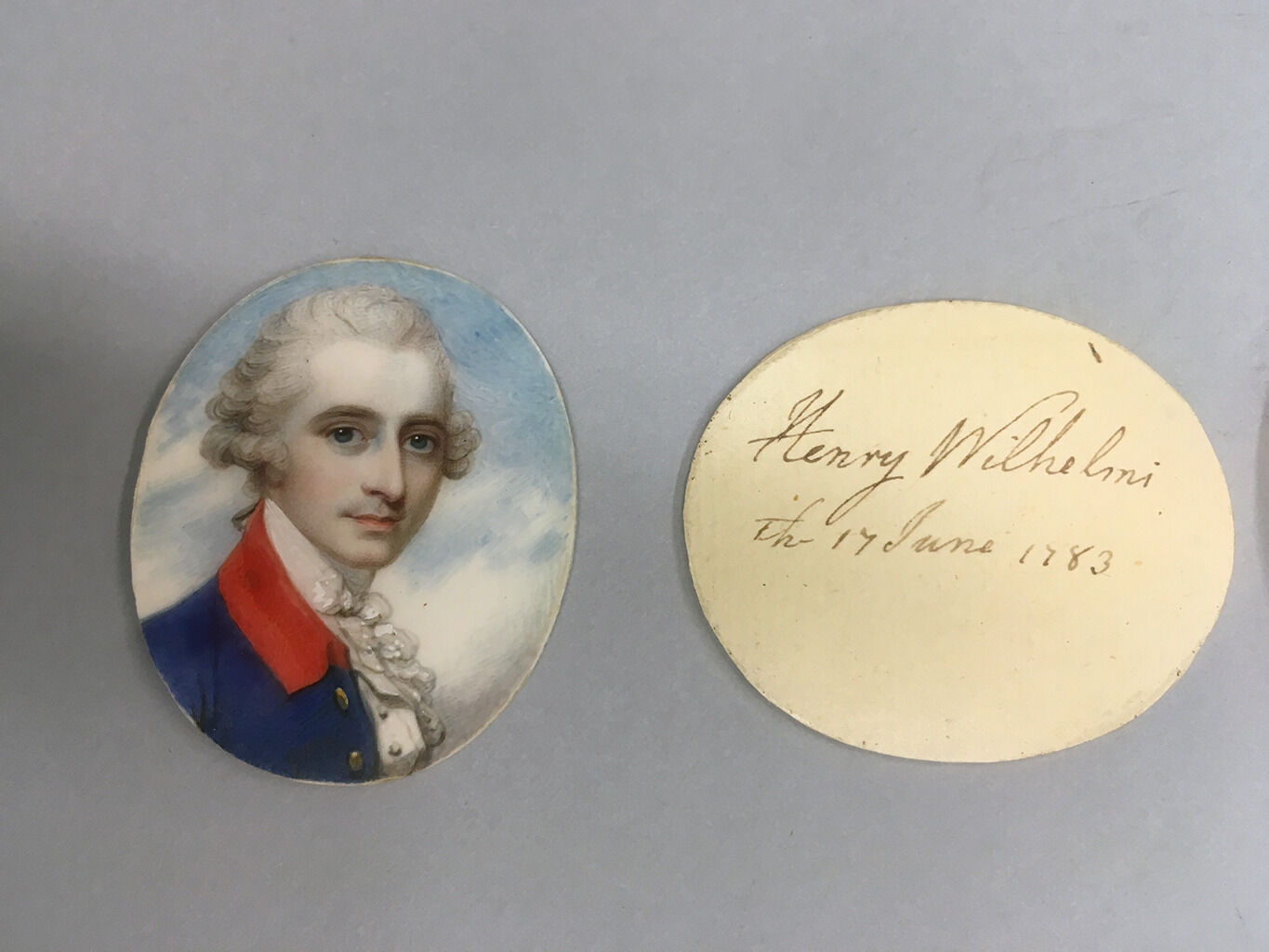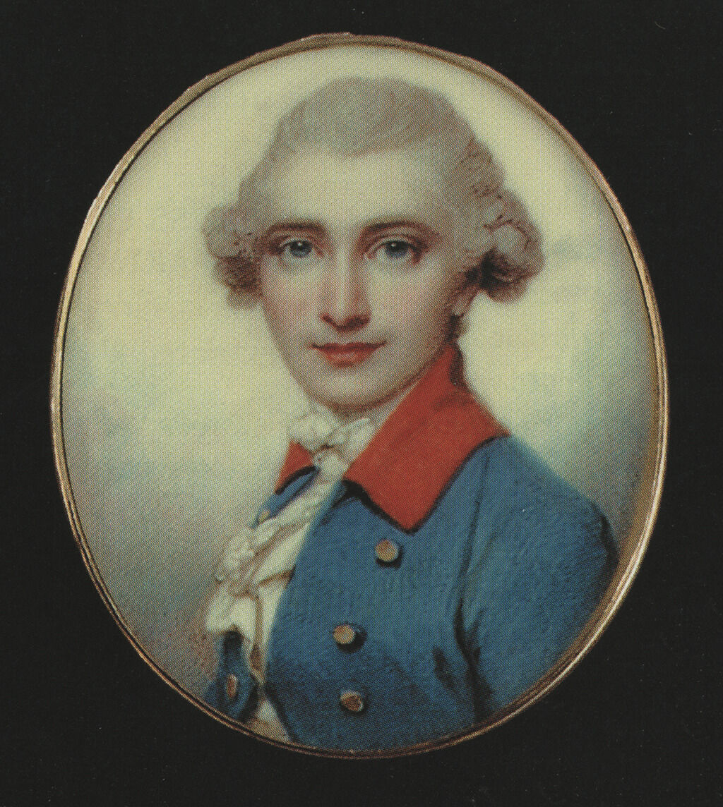 The subject of this miniature has traditionally been identified as William Nathan Wright Hewett, based on a later engraving on the back of the case. Some doubts were raised about this identification after the discovery of a card inside, inscribed “Henry Wilhelmi / Th 17 June 1783” (Fig. 1). Researchers have not yet uncovered any evidence of a Henry Wilhelmi residing in England at this time. While it is difficult to prove with absolute certainty, the discovery of a closely related miniature previously for sale at Christie’s, also attributed to Cosway, suggests that Hewett is indeed the most likely sitter (Fig. 2).1“Richard Cosway, R.A., Mr. W. J. N. [sic] Hewett,” sold at Important Gold Boxes, Objects of Vertu, Including Vinaigrettes, Christie’s, London, May 22, 2001, lot 166, https://www.christies.com/en/lot/lot-2047084. The Nelson-Atkins miniature depicts the sitter in three-quarters view, while he is facing forward in the Christie’s portrait. Their features are similarly idealized in Cosway’s characteristic manner, but both sitters have the same distinctive peaked hairlines, with wide blue eyes and straight brown brows. An aquiline nose is more prominently visible in the profile version. The sitter is erroneously identified as “W. J. N. Hewett” by Christie’s, based on the case inscription, which provides inaccurate initials for Hewett’s given names but correctly lists his date of birth and family members.2The inscription states in full, “28 Born April 19th 1756 Second Son of Selwood & Ann; Father of Cornwallis, Thomas Wrighte, Peter Selwood, Thomas, and William Wrighte by Martha [T]uting his first Wife. / Richard Cosway, R.A.” Hewett’s parents, Selwood Hewett (1728–1789) and Ann Wright (1727–1788), are recorded in his baptismal certificate; Parish Registers for Nottinghamshire, ref: PR8254.
