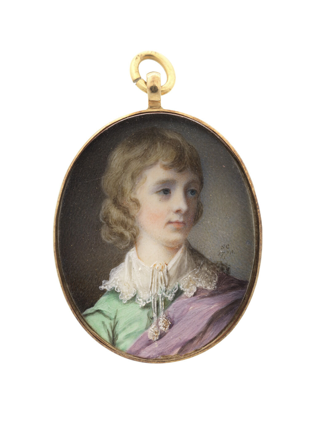 Tucked in between the curls of her pinned-up hair is a gauzy violet veil. It reappears at the nape of her neck, trailing down and around her shoulder until reaching the bottom of the frame and forming a floriated shape. Cotes reverses this purple and green color composition in his Portrait of Master Grosvenor, Probably Richard Grosvenor (Fig. 1), where a green blouse is visible on the sitter’s right shoulder and a purple sash stretches across his chest. Rather than dealing with intricate white lace in the present portrait, however, Cotes tackles a heavier material, outlining his female sitter’s shoulder in a swath of gold trim, like protective armor. Cotes signed the work with his characteristic “SC” initials and a 1774 date, the same year he exhibited a single miniature of a woman, perhaps this very portrait, at the Royal Academy.3The Exhibition of the Royal Academy (London: B. McMillan, 1774), 7. It remains uncertain whether this is the same portrait of a woman as the Nelson-Atkins miniature.