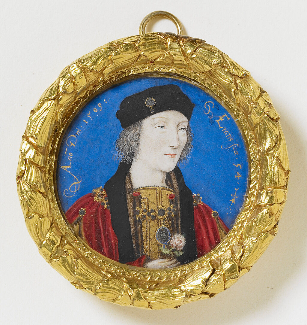 For a contemporaneous likeness of Henry VII, see Unknown (probably after Meynnart Wewyck), Portrait of King Henry VII of England, 1504/9, tempera and oil on panel, 12 5/8 x 9 in. (32.1 x 22.9 cm), Milwaukee Art Museum, M1989.63, https://collection.mam.org/details.php?id=4618. There is a later related miniature by Nicholas Hilliard, Henry VII, ca. 1600, watercolor and bodycolor on vellum laid on playing card, 1 3/8 in. (3.4 cm) diam., in the Royal Collection, RCIN 420012, https://www.rct.uk/collection/420012/henry-vii-1457-1509], part of the Bosworth Jewel. See also English School, Portrait of Henry VII, 16th century, oil on panel transferred to canvas, sold at Sotheby’s, London, December 6, 2012, lot 107, https://www.sothebys.com/en/auctions/ecatalogue/2012/old-master-british-paintings-day-sale-l12037/lot.107.html. See also Unknown Netherlandish artist, Portrait of King Henry VII, 1505, oil on panel, 16 3/4 x 12 in. (42.5 x 30.5 cm), National Portrait Gallery, London, NPG 416, https://www.npg.org.uk/collections/search/portrait/mw03078. Also possibly related is a miniature within a frame of eight belonging to the Duke of Buccleuch, illustrated in Stephen Lloyd, Portrait Miniatures from the Collection of the Duke of Buccleuch (Edinburgh: Scottish National Portrait Gallery, 1996), 26–27, 65, pl. 2, originally in the collection of Charles I at Whitehall (given to Charles by Theophilus Howard, 2nd Earl of Suffolk).