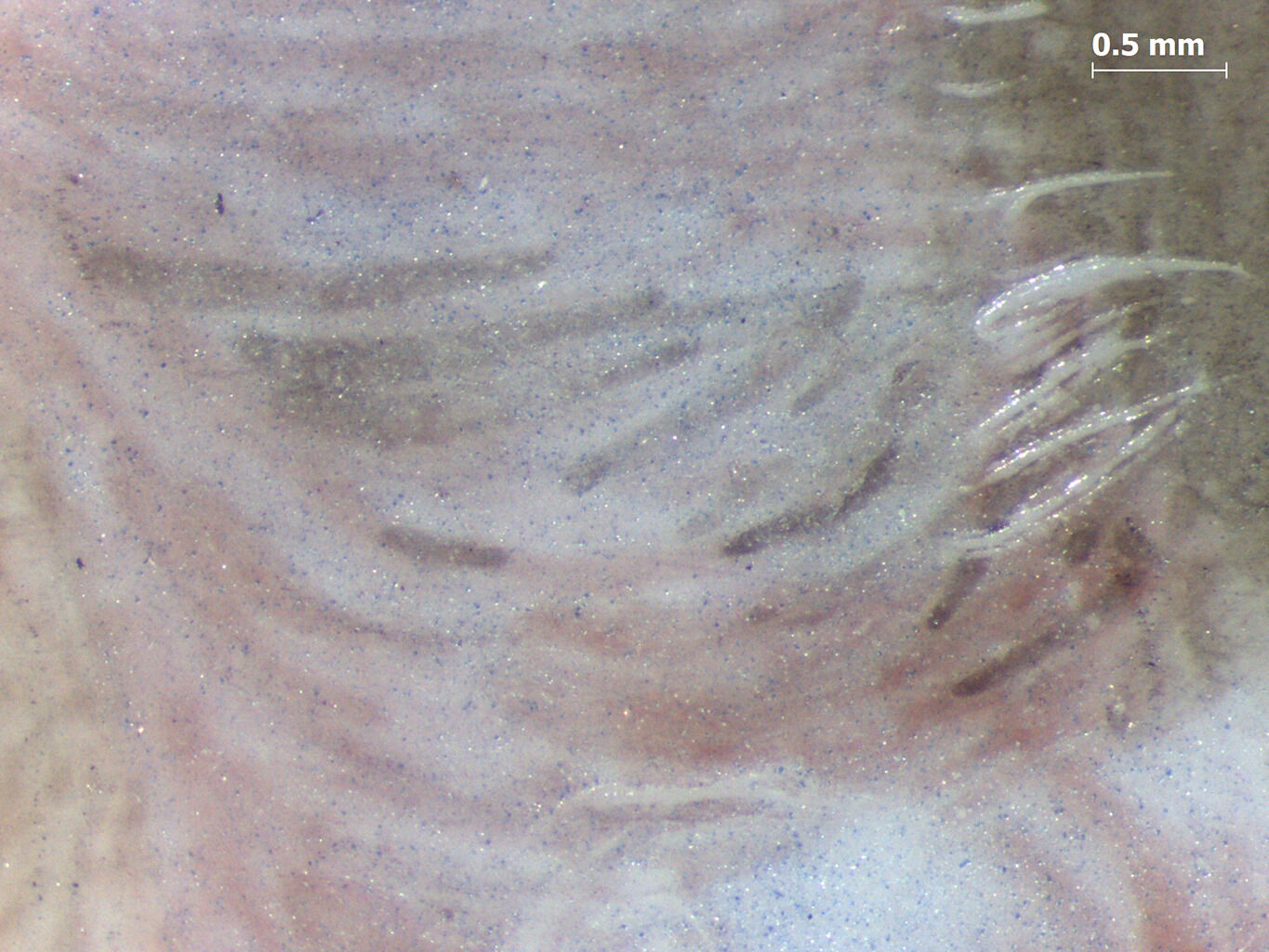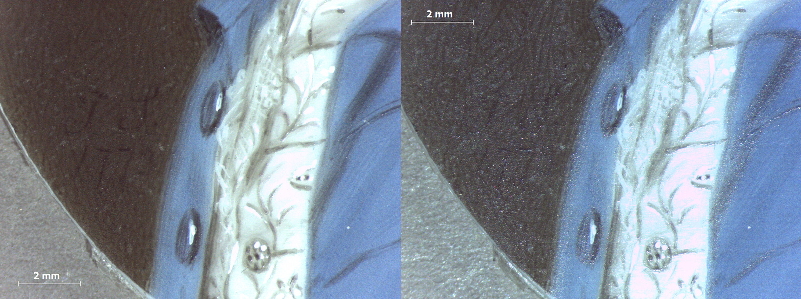 The lips were painted with two colors: deep magenta on the upper lip and a lighter peach color for the lower lip (Fig. 3). This dual lip color is a characteristic that has been observed on other Smart portraits in the Nelson-Atkins collection.8See the entire collection of miniatures by John Smart in this catalogue: https://nelson-atkins.org/starr/contents/Volume-4/John-Smart/. Thin lines of opaque red-brown pigment applied between the lips add further definition, followed by a final layer of clear glazing. A white highlight was added on the cleft, and bare ivory was used as a highlight along the lower lip line. Magenta hatching along the upper lip creates the faint appearance of a five o’clock shadow.