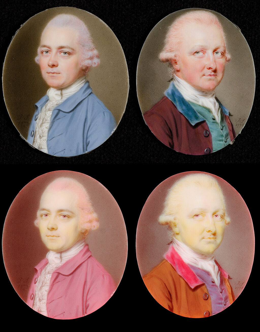 The saturation of the pink and gray-brown pigments gives the overall impression of pink hair color. However, Smart’s treatment of this sitter compared to the other male figure in Portrait of a Man, 1778 (F65-41/19) shows the subtle differences in the application of color in their hair. The lilac tone of F65-41/11 becomes more discernible in the side-by-side comparison of the two male portraits in both visible light and false-color infrared (FCIR): Images created through digital post-processing by combining and rearranging the color channels of visible and near-infrared images. In the visible image, the Red and Green channels are assigned to the Green and Blue channels respectively, while the infrared image is assigned to the Red channel. The false colors produced can aid in interpretation of media and materials present and inform further scientific analysis, conservation examination, and scholarly research. (Fig. 2a–d). In the FCIR images, the pink and lilac mixture in the hair of this male sitter presents as pink, while the pink hair of F65-41/19 presents as yellow, where the pigment mixture was found to contain only iron-based pigments and tin oxide. This visual difference in the false-color images of the male portraits is substantiated with elemental analysis where the pink false-color is indicative of ultramarine identified in the hair with scanning electron microscopy/energy-dispersive x-ray spectrometry (SEM-EDS): A combined technique that uses a scanning electron microscope and energy-dispersive x-ray spectroscopy to analyze materials. Performed on a microsample of paint, the SEM provides a means of studying particle shapes beyond the magnification limits of the light microscope. The SEM is routinely used in conjunction with an x-ray spectrometer so that elemental identifications can be made selectively on the same minute scale as the electron beam producing the images. SEM methods are particularly valuable in studying unstable pigments, adverse interactions between incompatible pigments, and interactions between pigments and surrounding paint medium, all of which can have profound effects on the appearance of a painting. and MA-XRF.6Pure ultramarine in gum arabic appears red in false-color IR. The pink tone in the FCIR image for this portrait is due to the pigment mixture that has been found to contain ultramarine and iron-based pigments. This behavior—an aggregate or summed-response for all the pigments that influence the false color appearance—explains why technical imaging allows inferences to be drawn but is seldom sufficient to confirm or exclude the presence of a pigment. Antonino Cosentino, “Identification of Pigments by Multispectral Imaging: A Flowchart Method,” Heritage Science 2, no. 8 (March 17, 2014): https://doi.org/10.1186/2050-7445-2-8; Joanne Dyer and Nicola Newman, “Multispectral Imaging Techniques Applied to the Study of Romano-Egyptian Funerary Portraits at the British Museum,” in Mummy Portraits of Roman Egypt: Emerging Research from the APPEAR Project, ed. Marie Svoboda and Caroline R. Cartwright (Los Angeles: J. Paul Getty Museum, 2020), https://www.getty.edu/publications/mummyportraits/part-one/6/; Paolo A. M. Triolo, “Implementation of the Diagnostic Capabilities of the CMOS Sensor in the NIR Environment, Using 1070 nm Interference Filter and a Conventional IR-pass Filters Set,” in “Analytical Techniques in Art and Cultural Heritage: Selected Contributions from the TECHNART 2023 Conference, Lisbon, Portugal, May 7–12, 2023,” special issue, Journal of Cultural Heritage 70 (November–December 2024): 54-63, https://doi.org/10.1016/j.culher.2024.08.007.