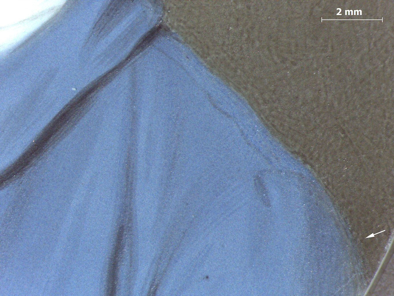 While literature calls out the use of a gum arabic: Derived from the sap of the African acacia tree, gum arabic was commonly used to bind watercolor pigments with water. In addition to its use as a binder, miniaturists capitalized on its glossy effect to create areas of highlight with larger quantities of gum. As with ivory, its availability benefited from trade routes that were expanding due to colonialism and the Atlantic slave trade. solution alone to create hatched shadows that saturate and darken the matte gouache, this portrait seems to rely on plant gum in mixture with pigment. Under normal illumination, the drapery and shadows match the matte appearance of the blue coat. This behavior contrasts with that of the other male portrait in this study, F65-41/19, in which the shading has a glossier appearance, suggesting the use of a heavier application of plant gum that provides greater saturation and gloss. Here, the hatched midtones present as a matte, medium blue color. The darker midtones appear to have some black added to the mixture, while the darkest shadows read as matte black. A raking-light detail of the coat reveals subtle variations in the treatment of the drapery, showing a slight glossy finish in the blacks and a matte finish in the blue midtones (Fig. 4a,b). The two blue buttons show a similar treatment in the shading with the addition of highlights painted with white impasto: A thick application of paint, often creating texture such as peaks and ridges.. A pentimento: From the Italian for “repentance,” a pentimento or pentiment, plural pentimenti, is an area revealing an element of the composition that has been moved or removed from the final composition. This is typically seen in underdrawing or elements hidden beneath added layers of paint, called overpaint. Pentimenti can be revealed by thinning layers of paint over time, or through the course of technical analysis with methods like x-radiographs or infrared reflectography. is visible along the man’s left arm where the composition was adjusted to widen the sleeve, and the brown background has become visible as the painting has aged (Fig. 5).
