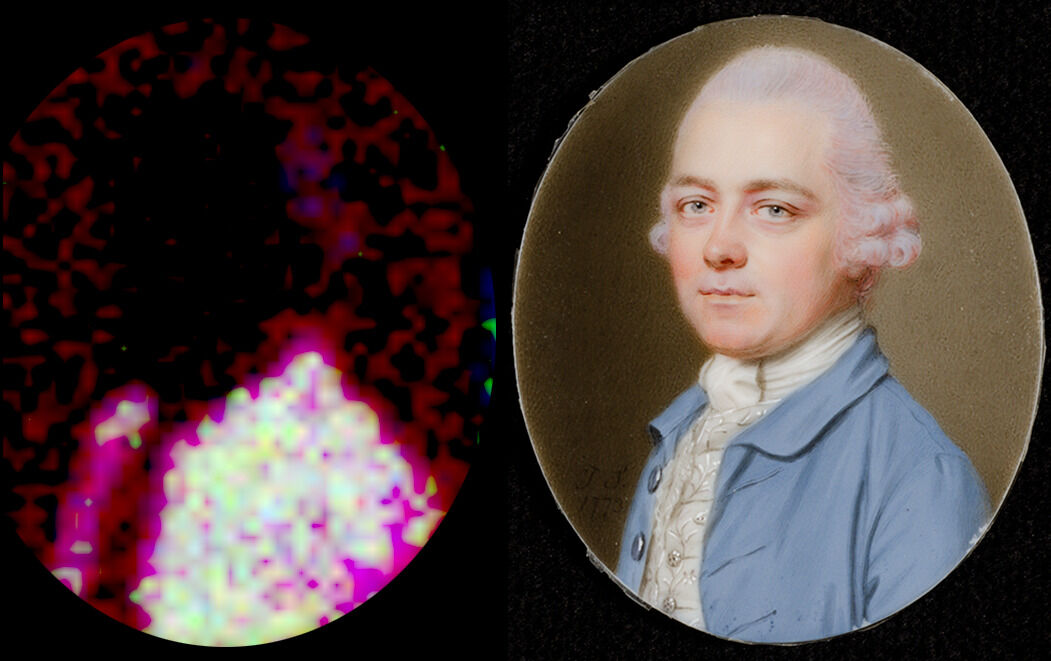 The unusual color of the man’s hair is shared with eleven other sitters in the Nelson-Atkins collection as well as others in John Smart’s wider corpus outside the collection.1See Aimee Marcereau DeGalan, “Pretty in Pink: John Smart’s Penchant (or Not) for Pink Hair,” in this catalogue. As Aimee Marcereau DeGalan has shown in her introductory essay, pink or lilac hair powder was uncommon in portraiture, with most subjects opting for white or grayish-white. However, Smart’s portraits of his merchant-class clientele reveal hints of pink and lilac hues, raising the question of whether this was a deliberate choice or the result of light-sensitive pigments fading over time, obscuring their original effect. Pigment analysis and technical imaging were performed on four John Smart portraits with light pink or lilac-tinted hair, spanning a twenty-five-year period of his career, to explore the artist’s palette and working techniques beyond the means of visual examination.2See John Smart, Portrait of a Man, 1778, F65-41/19; Portrait of Charlotte Porcher, 1787, F65-41/28; and Portrait of Mrs. Ronalds, 1798, F65-41/39.,3The scientific study of the four John Smart portraits via x-ray spectrometry and SEM analysis was carried out by John Twilley, Mellon Science Advisor, with support of an endowment from the Andrew W. Mellon Foundation for conservation science at the Nelson-Atkins Museum of Art.
