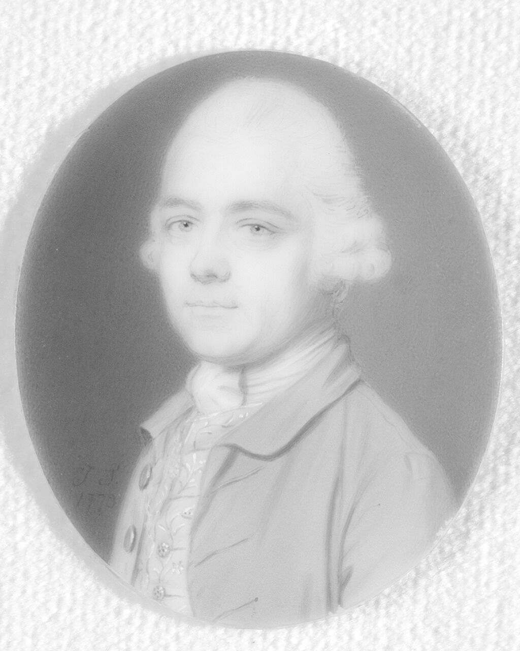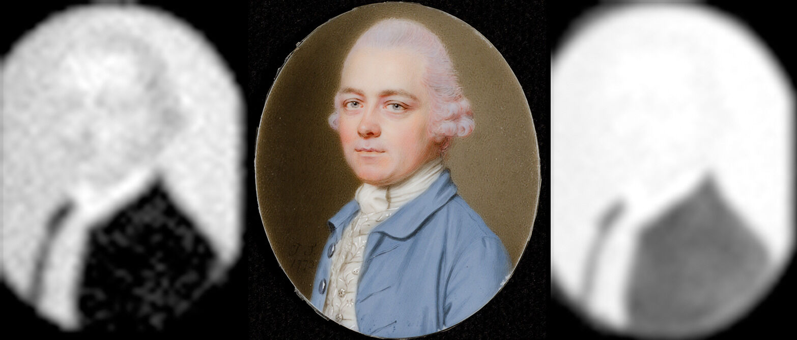 The paint surface has several losses around the perimeter of the ivory support. The largest along the bottom of the blue frock coat remain mostly obscured by the edge of the case. Heavy mold on the paint surface was removed during conservation treatment, allowing the date to be clarified as 1773 rather than 1770.10This miniature was dated to 1770 in the 1971 Starr collection catalogue. Ross E. Taggart, The Starr Collection of Miniatures in the William Rockhill Nelson Gallery (Kansas City, MO: Nelson Gallery-Atkins Museum, 1971), no. 96, p. 37. The date changed periodically until 2021, when the miniature was conserved.