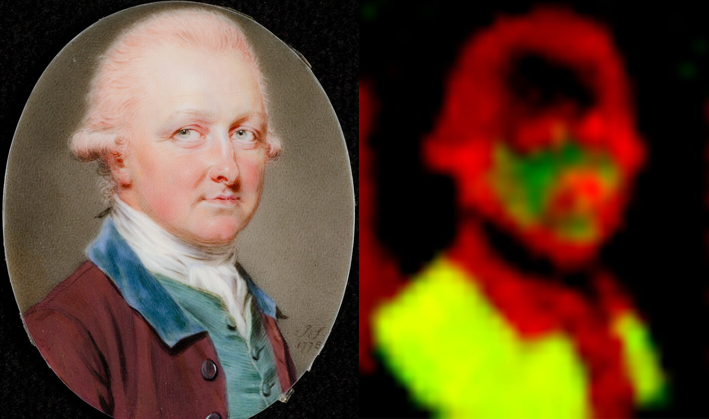 This unidentified sitter is presented in a plum frock coat with a turned-down blue velvet collar, worn over a teal broadcloth waistcoat edged in gold. Beneath this, he wears a high-collared white shirt with a stock: A type of neckwear, often black or white, worn by men in the eighteenth and nineteenth centuries. neatly tucked into the top of his waistcoat. Set against a solid brown background, the man is shown in three-quarters view, turning his head slightly over his right shoulder. His flushed face, deeply tinged as if from sun exposure or excessive drink, draws immediate attention, creating a vivid contrast with the cool hues of his clothing. This deep hue, especially in the lower half of the sitter’s face, was achieved using the durable mercury-based, reddish-purple pigment vermilion, which is unique in this miniature and does not appear in the four others in the Nelson-Atkins collection that underwent x-ray fluorescence spectrometry elemental mapping (MA-XRF) or XRF elemental mapping: A non-destructive technique that entails collecting thousands of x-ray fluorescence spectra at regular intervals across a painting to build an alternate set of images depicting the locations and amounts of different elements. Although the information is fundamentally the same as measurements gathered from a single-point XRF, the graphical nature of the result is often a more powerful technique for understanding trends in an artist’s use of materials. The high number of spectra allows statistical manipulations of the elemental information to locate correlations between different pigments that would not be possible from a small number of tests. For example, the consistent occurrence of mercury along with chromium, and iron along with copper, could show that vermilion was used to mute the chrome green and red ocher was similarly employed in a mixture that includes emerald green. The resulting correlation maps then serve to show where the two cases occur in the composition. MA-XRF can also reveal preliminary paint applications that became covered as the composition was completed, thereby disclosing aspects of the painter’s method. as part of this catalogue research.1The study of John Smart’s palette was part of a Mellon Science Research project undertaken by John Twilley with the support of NAMA objects conservator Stephanie Spence. The research question grew out of the prevalence of pink hair among Smart’s sitters alongside the lack of pink hair among Smart’s contemporaries, other than those associated with his circle, in oil or miniature. This miniature was one of four examined as part of this discrete study, the results of which appear in the technical entry accompanying this curatorial entry. See John Smart, Portrait of a Man, 1773, F65-41/11; Portrait of Charlotte Porcher, 1787, F65-41/28; Portrait of Mrs. Ronalds, 1798, F65-41/39. Although the red pigment carmine was preferred by many watercolorists and oil painters, including English portrait painter Sir Joshua Reynolds (1723–1792), because of its transparent qualities, which allowed artists to build up tone, it was widely known to be fugitive pigments: Fugitive pigments are not lightfast, which means they are not permanent. They can lighten, darken, or nearly disappear over time through exposure to environmental conditions such as sunlight, humidity, temperature, or even pollution.. Thus, artists, like Reynolds switched to vermilion in the late 1760s. It is quite possible that Smart, who was a pragmatic man, was also aware of carmine’s shortcomings and opted for metal-based pigments like vermilion or iron oxide, as we see elsewhere in his compositions.