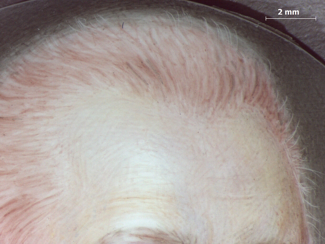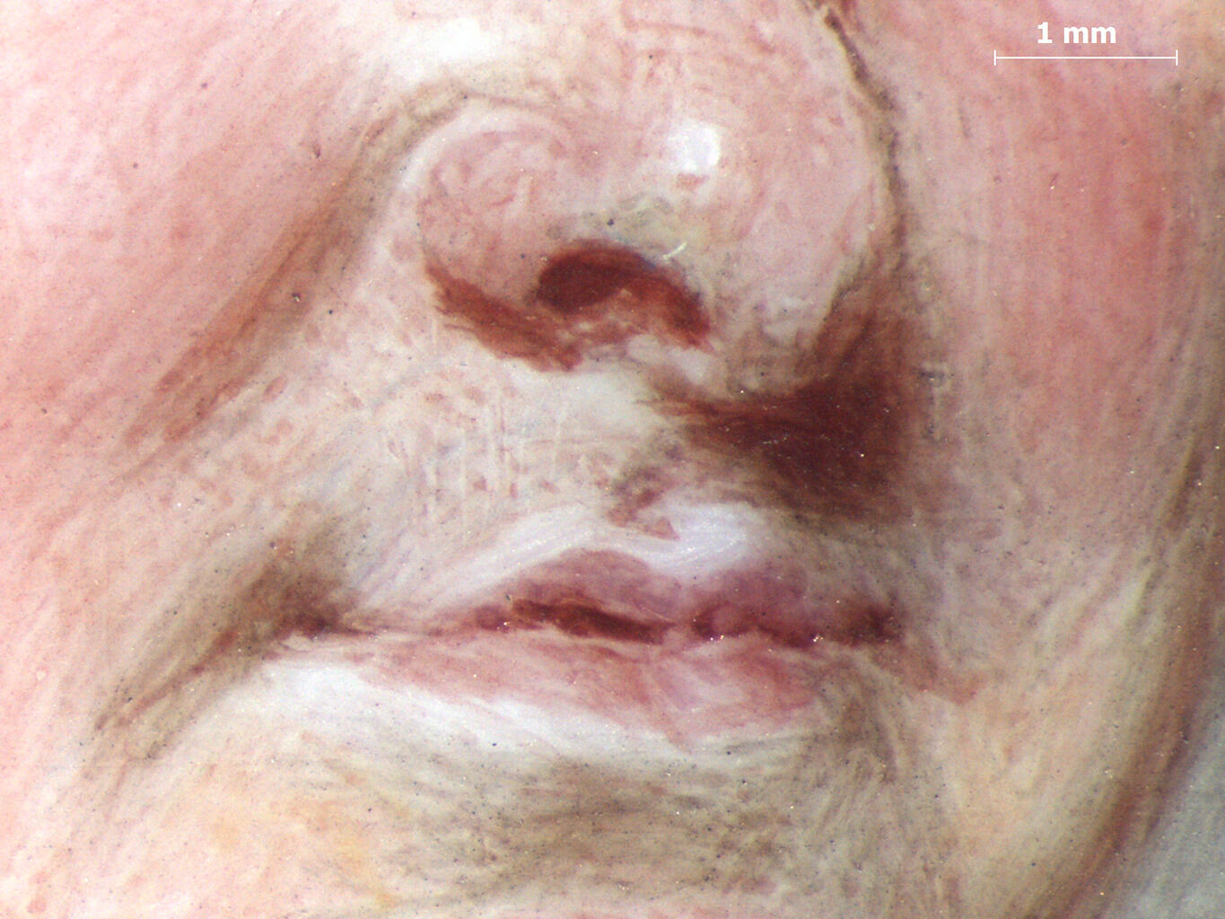The forehead is notably lighter in complexion, painted with pale yellow, peach, and a translucent wash of magenta, suggesting the man may have worn a hat that protected the top of his head from the sun. Of the two white pigments employed in this portrait, tin oxide was used in the skin and facial features, though not necessarily in the highlights. Blue was used sparingly in the skin tones to deepen shadows and brighten some of the whites, such as the highlight along the bridge of the nose. In Smart’s meticulous style, he included the subtle wrinkles of the forehead with delicate strokes of color and sgraffito: In Italian, meaning “scratched,” an art technique consisting of scratching through layers of paint. (Fig. 2), demonstrating his attention to the most minute of details that make his portraits so realistic compared to the stylized portraiture of other contemporaries such as Richard Cosway (1742–1821). The man’s cleft chin and crow’s feet were painted with darker tones of brown and red. The shadowy area along the man’s jawline was painted with brown hatching and lines of sgraffito to emphasize the shape of his cleft chin. The contour of the man’s nose has a dark outline in short, sketchy brushstrokes of red brown that accentuate the bulbous tip and bump on the bridge.