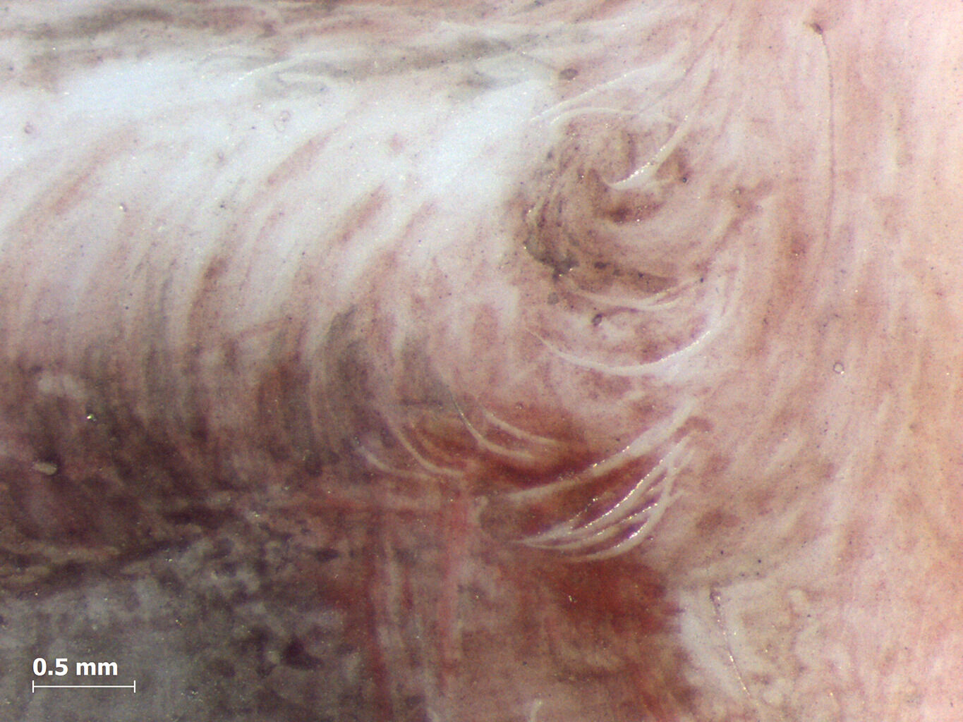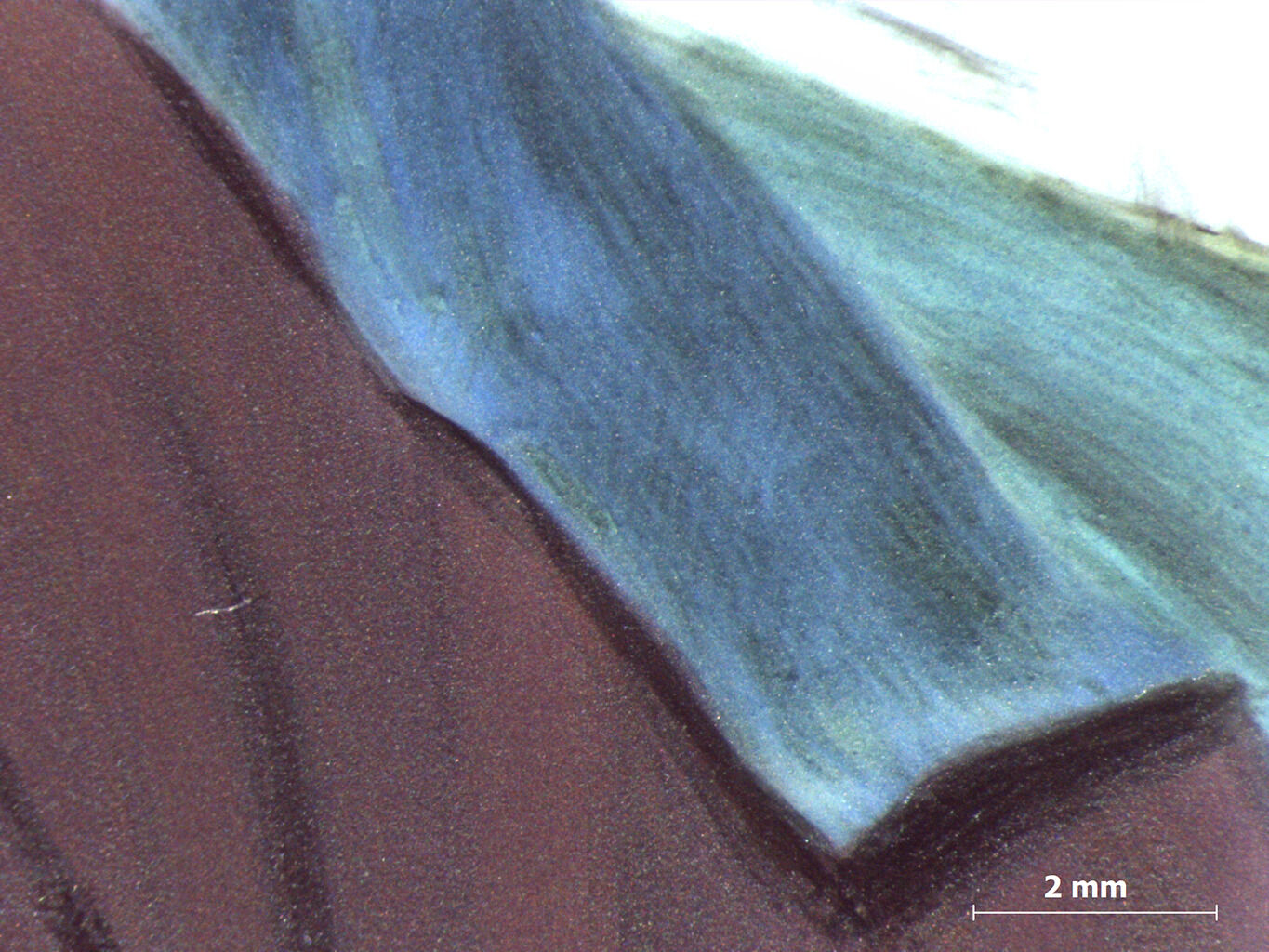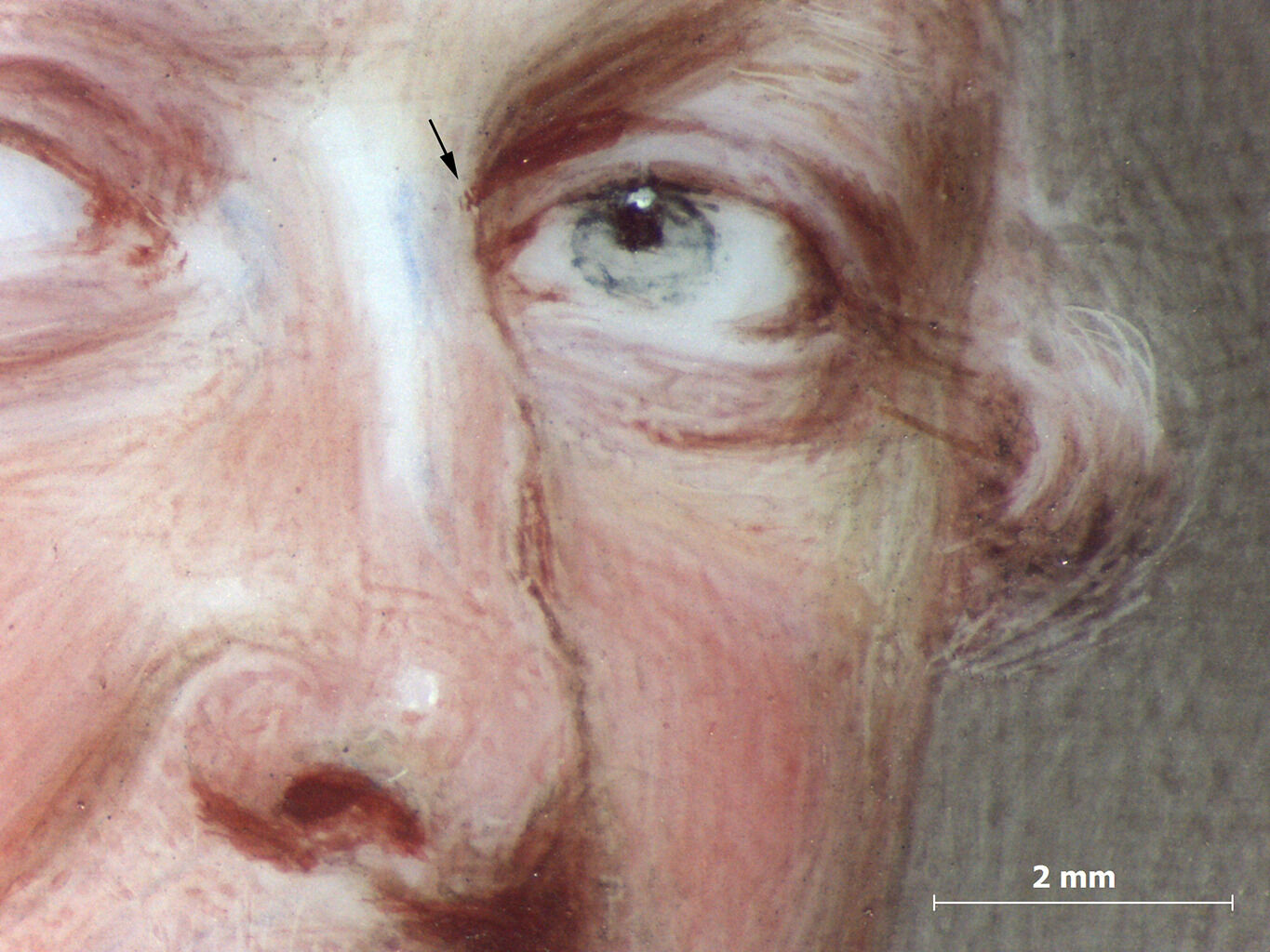 The man’s light green eyes are a mixture of transparent blue and green. The irises are outlined in blue and filled with a translucent green so light that the eyes appear icy from a distance. Smart used delicate stippling: Producing a gradation of light and shade by drawing or painting small points, larger dots, or longer strokes. of red shading along the outer edge of the cornea. Under magnification, the dark red shadow above the left eye was corrected by the artist where it initially extended into the nose. Microscopic sgraffito, only visible with high magnification, was employed to scratch out part of the line (Fig. 5).