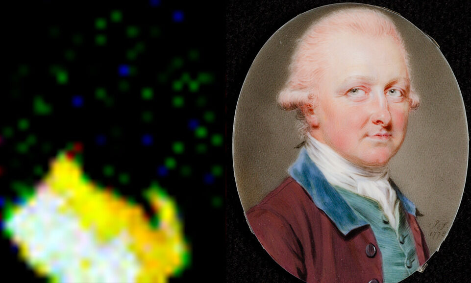 Among the four portraits analyzed, the artist differentiated the means of painting based on the gender of the sitters. The female depictions, whose fair complexions rely more on the whiteness and translucence of the ivory support, were much more thinly painted than those of the males, whose ruddy complexions required the ivory to be more heavily painted. This difference also extends to the representations of their clothing. In MA-XRF elemental mapping, these differences become apparent where the more intense response from the heavier paint of the male portraits reveals more information about minor components of their pigment mixtures. The results, summarized in Table 1, are discussed in further detail below. In this example, Smart deviated from his palette for the other three portraits with the inclusion of a mercury-based pigment, in the form of vermilion, to create the man’s flushed appearance. The sitter’s round face and full, rosy cheeks give the appearance of a heavyset man with a sunburnt complexion, suggesting he may have spent significant time outdoors. Pink, peach, and light red hues built up in layers of dense hatched: A technique using closely spaced parallel lines to create a shaded effect. When lines are placed at an angle to one another, the technique is called cross-hatching. create the flushed tones in his cheeks, chin, and nose. While the map for iron confirms the presence of iron oxide pigments around the eyes, mouth, and jawline, the mercury map shows a clear delineation of the vermilion application ending below the eyes with some overlap of the pigments in the lower features (Fig. 1).