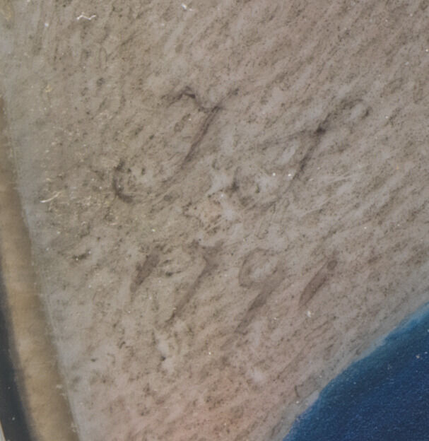 The miniature once belonged to Jeffery Whitehead (1831–1915), who owned a range of Smart miniatures, several of which included sitters with prominent military identities, so it is possible that Whitehead, or an unscrupulous dealer, added Pellew’s name to the work.4His military miniatures included portraits of Colonel Montalba (1771), Admiral Sir Charles Saunders (1778), Captain G. H. Towry (n.d.), Lieutenant General Charles Cornwallis (1792), and likely others. In additional to Admiral Pellew, Whitehead owned two other Starr miniatures: Portrait of a Man (1788) and Portrait of Lieutenant General Charles Cornwallis, 1st Marquess Cornwallis (1792). One more curiosity about this portrait remains: the miniature lacks Smart’s hallmark “I” inscription, which he included with miniatures made during his tenure in India (1785–1795). The date was examined more closely through high-resolution imagery, bringing up the possibility that the 1791 date may instead be 1797, which would align with Smart’s London work. However, the puddle of pigment atop the final number of the date indicates the start or stop of a brushstroke, and the tail of the first and last digit are shorter than the “7,” thus confirming it is a “1” (Fig. 2). There are very few other examples of Smart miniatures from his time in India that are not inscribed with an “I.”5Although it is difficult to tell without high-resolution imaging, there are two other possible examples: Portrait of Muhammed ‘Ali Khan, Nawab of Arcot and Prince of the Carnatic, 1789, watercolor and bodycolor on ivory, 1 x 3/4 in. (2.6 x 1.9 cm), sold at Sotheby’s, London, “Old Master and British Drawings,” July 3, 2013, lot 159, https://www.sothebys.com/en/auctions/ecatalogue/2013/old-master-british-drawings-l13040/lot.159.html; and Portrait of a Man, 1788, watercolor on ivory, 2 1/4 x 1 5/8 in. (5.7 x 4.1 cm), Nelson-Atkins Museum of Art, F65-41/29.