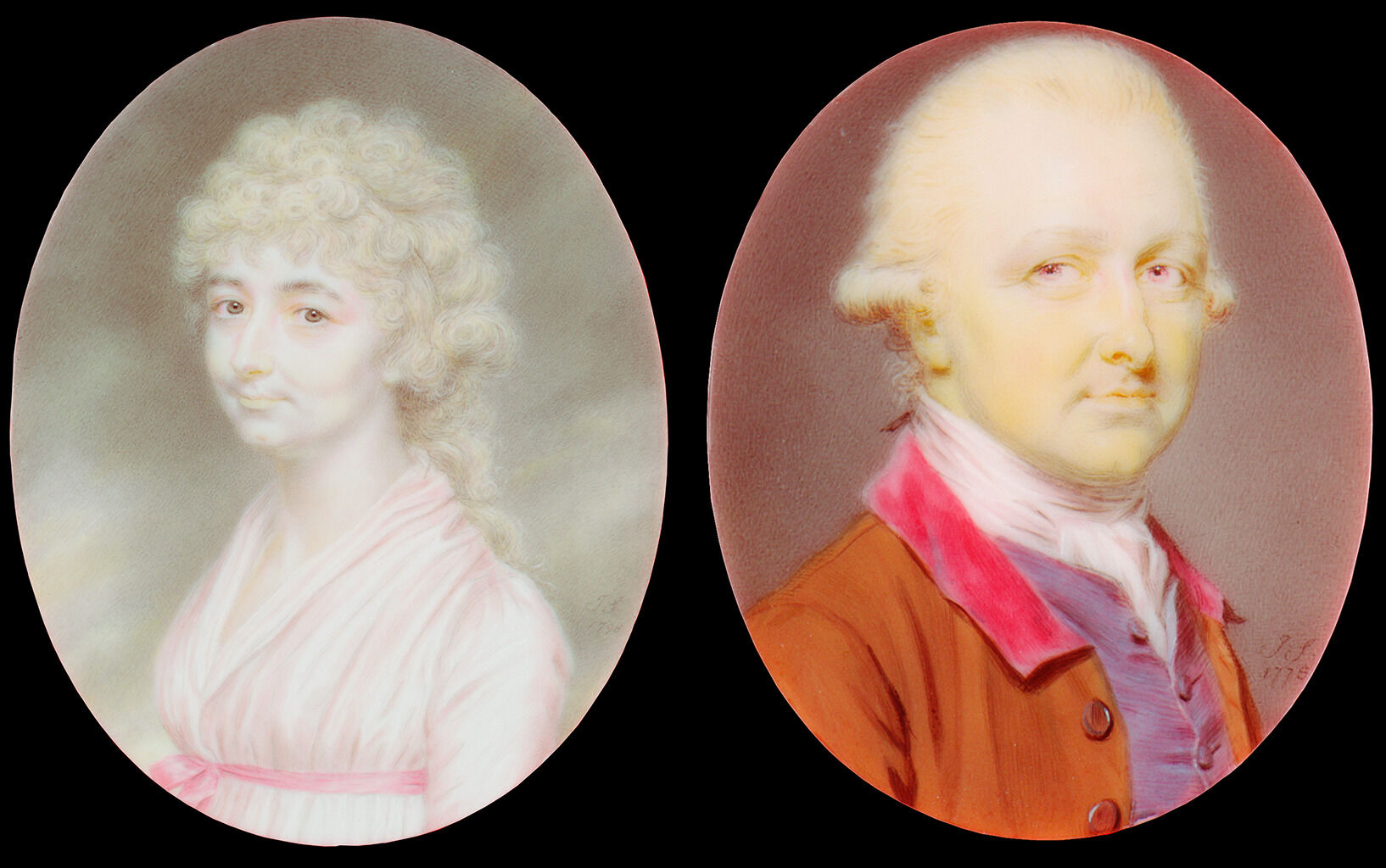 Although the Ronalds name was rare in southern England, family historian Beverley Ronalds believes the sitter may be from her family line.5Beverley Ronalds to the author, August 20, 2024; related correspondence in NAMA curatorial files. Two potential candidates have emerged: Elizabeth Ronalds, née Clarke (1758–1823), who came from a middle-class family involved in the silk trade,6Beverly F. Ronalds, “An Ancestor’s Life seen through Her Recipe Book,” Women’s History: The Journal of the Women’s History Network 2, no. 17 (Spring 2021): 20, https://womenshistorynetwork.org/wp-content/uploads/2021/04/Spring21Online.pdf. and her sister-in-law Jane Ronalds, née Field (1766–1852).7I am grateful to Finn Miller, curatorial assistant, for his genealogical research assistance on the Ronalds family. Elizabeth married her cousin Hugh Ronalds on September 9, 1784, and they commissioned portrait miniatures around 1810. That known portrait of Elizabeth (Fig. 1) shows a woman with brilliant red hair and, most important, blue eyes, which do not align with the Nelson-Atkins sitter. Jane Ronalds, who married Hugh’s brother, Francis, was described as having darker features and remains a speculative possibility, though no definitive link can be made based on existing evidence (Fig. 2).