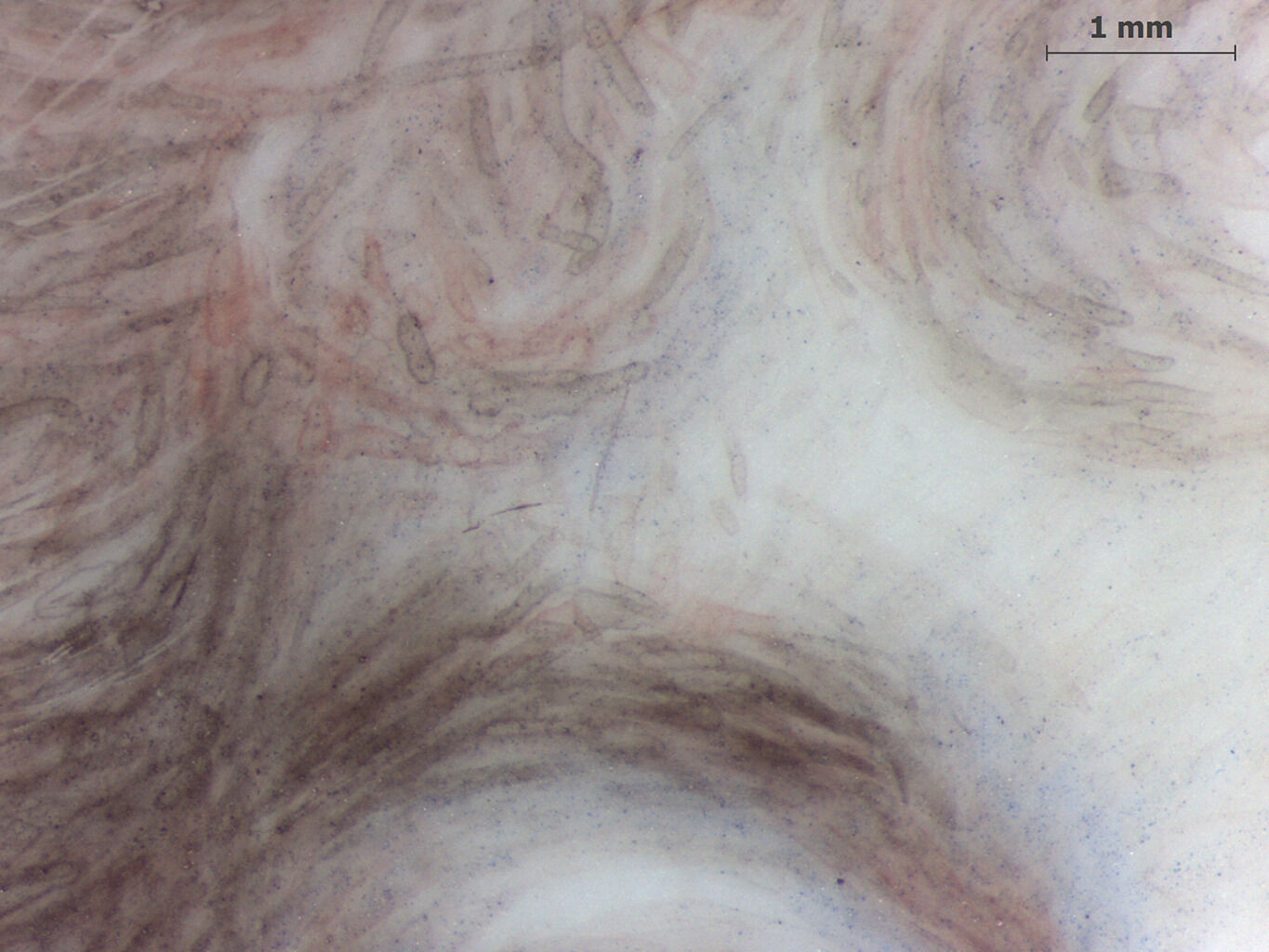 Mrs. Ronalds wears her hair in long, natural curls cascading down her back. Her light pink hair is pulled back with a headband of similar color that is partially visible on the sitter’s left side. This more relaxed, natural hairstyle, compared to the wide, frizzled: A form of tightly curled hair fashionable in the latter half of the eighteenth century. halo of Charlotte Porcher (F65-41/28), became popular at the end of the eighteenth century as powdered hair fell out of fashion. The pink tint was applied in fluid swaths of color, with a combination of broad strokes layered with finer hatching for deeper shades. Short, rounded strokes of light brown define the curls and headband, as well as shading around the neck. Under magnification, the application sequence is evident, revealing that the brown pigment was applied on top of the pink (Fig. 4). At the nape of her neck, the shadows contain dense areas of directional hatching following the curvature of the neck. Other areas of shading in the curls show how Smart laid in daubs of transparent brown paint to darken the shadows. Notably, this is the same iron oxide–based color used in the background, and Smart is relying on the pink tones and ivory to define the edge of her hair. Although used with greater restraint in this portrait than in others, Smart employed sgraffito: In Italian, meaning “scratched,” an art technique consisting of scratching through layers of paint. to reveal bare ivory for the curl highlights.
