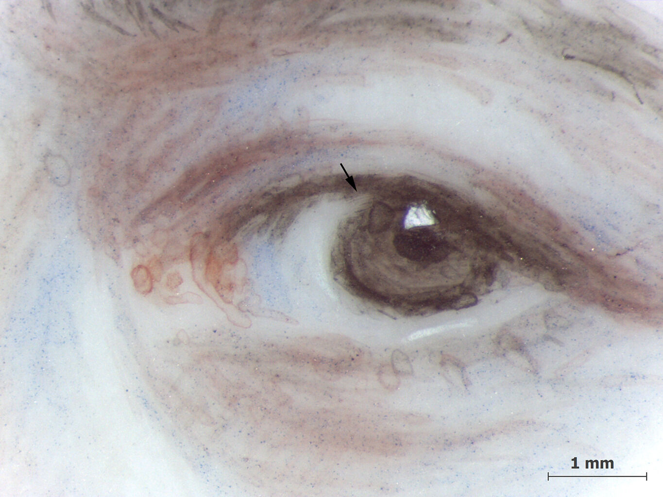 The contours and shading around her brown eyes are rendered in blue, brown, and warm pink midtones. A detail of the left eye demonstrates the variety of brushstrokes in Smart’s repertoire (Fig. 6). The brown upper lash line and purple eyelid crease are painted with long, curving strokes layered to create deeper tones while the pink and purple shading around the eye and brow bone consist of shorter, directional hatching. The lower lashes and red corner of the eye are thin daubs of fluid color with visible layering of the red pigment. A wash of blue pigment around the eye was applied last. The highlights on the brow bone and under the eyes are bare ivory. The whites of the eyes are bare ivory, with white highlights painted around the iris and blue in the corners for contouring. Figure 6 also shows a revision of the composition to the left of the iris, where the artist erased the brown paint to adjust the shape, possibly with a needle-like instrument.