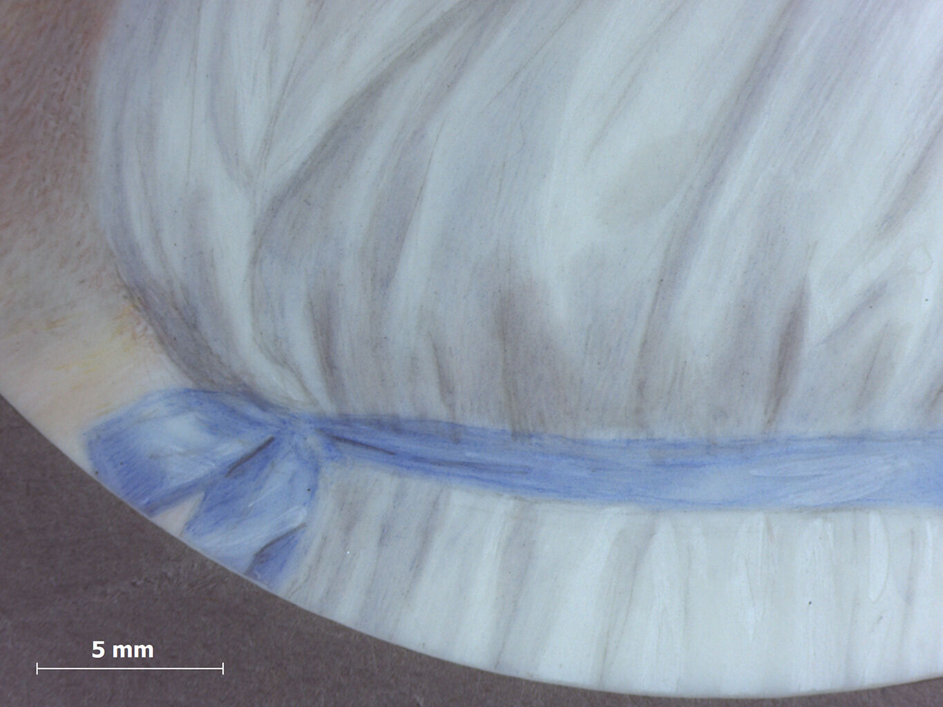 Mrs. Ronalds wears a white V-neck empire-waist dress that relies heavily upon the ivory support to achieve its lightweight, delicate appearance. The drapery in both the dress and the sash was sketched in pencil that remains exposed as an obvious inclusion in the composition. White highlights added after the initial pencil sketch are opaque and have low impasto: A thick application of paint, often creating texture such as peaks and ridges. (Fig. 7). Shading in the drapery is predominantly pencil lines and thin washes of widely dispersed blue paint (the same used in the face). This use of blue enhances the whiteness of Mrs. Ronalds’ dress and adds a crispness to the fabric not seen in the other female portrait examined for this study (F65-41/28). Light gray lines are used sparingly throughout to add to the shading.