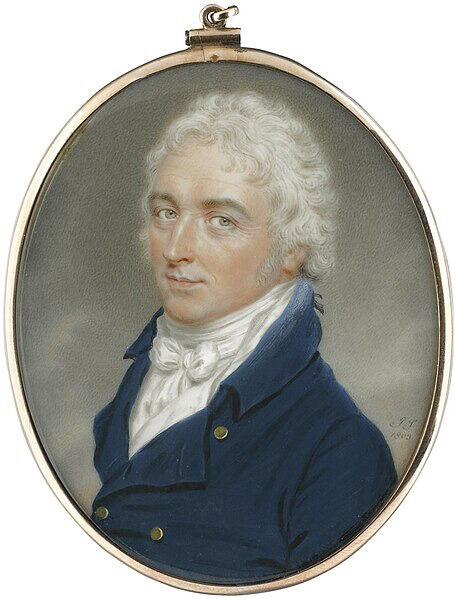 The man in this portrait was previously identified as Richard Lovell Edgeworth (1744–1817), the Anglo-Irish politician, inventor, writer, and father of the celebrated novelist Maria Edgeworth, perhaps due to the letters “RE” monogrammed on the back of the case.1The initials could perhaps relate to a previous owner, or perhaps the case was switched with another including these initials, as was often done. However, a comparison of this example to numerous extant portraits of Richard Edgeworth reveals no resemblance. He had fleshy pursed lips, close-set eyes, and a distinctive high hairline, visible in all of his likenesses made over several decades (Fig. 1).2See also Hugh Douglas Hamilton, Richard Lovell Edgeworth, ca. 1800, oil on canvas, 30 5/16 x 25 9/16 in. (77 x 65 cm), National Gallery of Ireland, Dulbin, http://onlinecollection.nationalgallery.ie/objects/2732. Note that another miniature by Smart, “traditionally identified as Richard Lovell Edgeworth,” does not resemble either the Nelson-Atkins sitter or Edgeworth: John Smart, A Gentleman Traditionally Identified as Richard Lovell Edgeworth, 1807, watercolor on ivory, 2 1/2 in. (6.4 cm) high, sold at Bonham’s, London, “Fine Portrait Miniatures,” November 19, 2014, lot 119, https://www.bonhams.com/auction/21452/lot/119/.