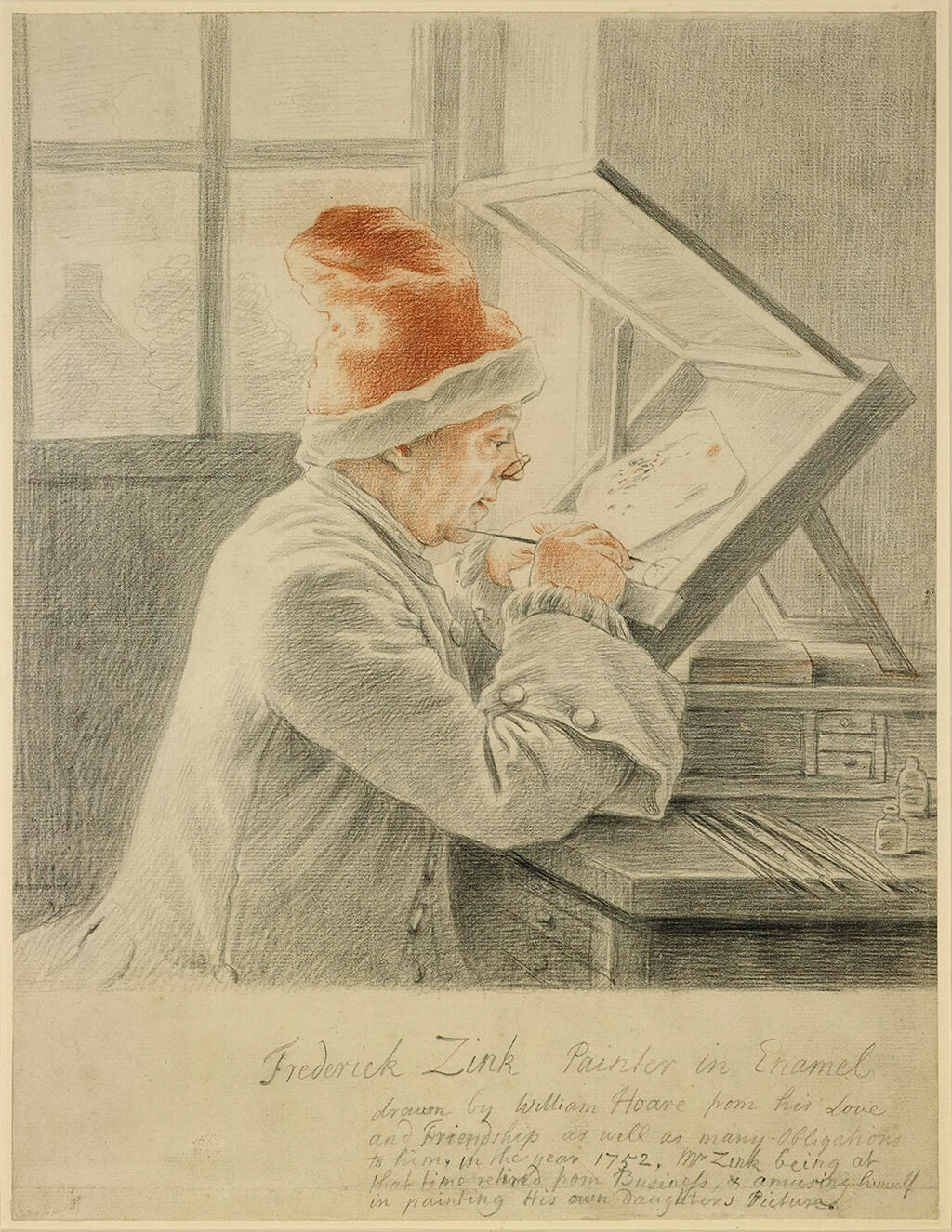 Reynolds, “Zincke, Christian Frederick.” The drawing is inscribed on the back by Hoare, “Frederick Zink Painter in Enamel drawn by William Hoare from his love and friendship as well as many obligations to him, in the year 1752, Mr Zink being at that time retired from business, & amusing himself in painting his own daughter’s picture.”