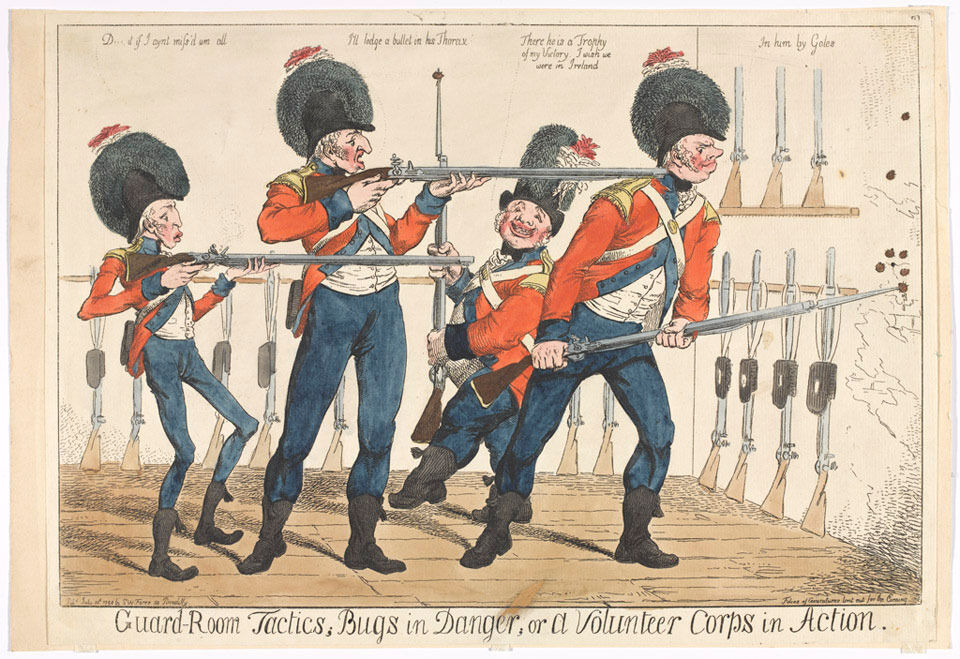 However, the England he returned to was not the same as the one he had left in 1785. The period between 1793 and 1802, known as “The Years of Endurance,” was marked by the looming threat of Napoleonic Wars: A series of major global conflicts fought during Napoleon Bonaparte’s imperial rule over France, from 1805 to 1815., prompting the formation of volunteer units for England’s defense.2See Arthur Bryant, The Years of Endurance, 1793–1802 (London: Reprint Society, 1944). In 1798, Smart, along with several other artists, including his friends Robert Smirke (1780–1867) and Samuel Foote (1720–1777), joined the St. Pancras Association Volunteers.3The London Gazette, August 23, 1803, 1102. Richard (1772–1857) and George (ca. 1782–1850) Twining were also in the infantry. Smart Senior painted numerous miniatures of the Twining family. Foskett, John Smart: The Man and His Miniatures, 22. Although these volunteer formations were sometimes mocked (Fig. 15), evidence suggests that both Smart and his son John Smart Junior (1777–1809) took their military involvement seriously.4As outlined by Starr Research Assistant Maggie Keenan in her biography for John Smart Junior, John Smart and John Smart Junior developed a musket that they introduced to the Board of Ordnance in 1806, capable of executing one thousand men.