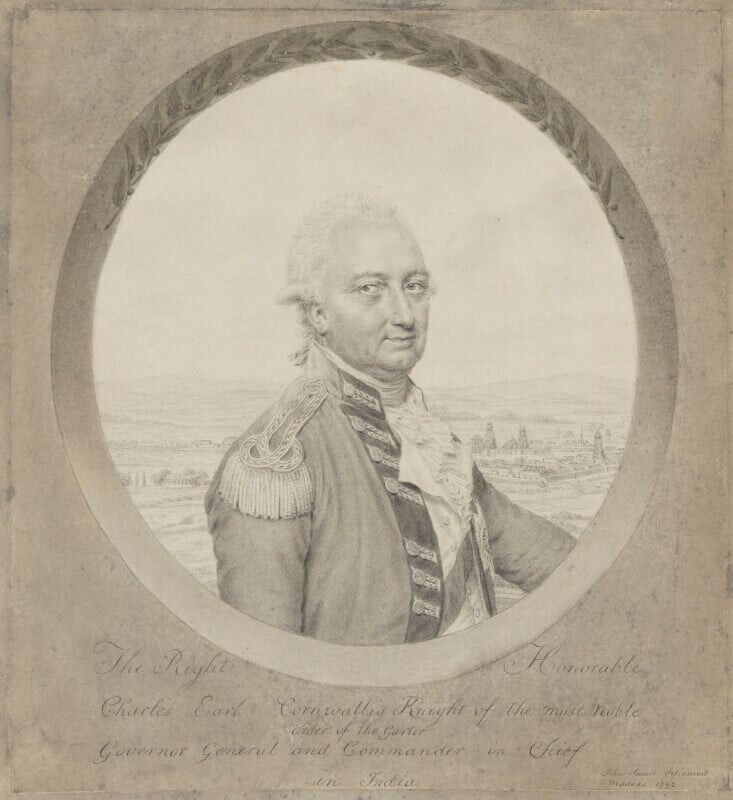 For this reason, miniatures were popular among military and particularly naval officers who served with the HEIC.26See Maggie Keenan, “Dressing Smart: The Military Portraits of John Smart and John Smart Junior.” For more on the complex relationship between Britain’s military and the HEIC’s own naval fleet and vast private army, see T. A. Heathcote, The Military in British India: The Development of British Land Forces in South Asia, 1600–1947 (Manchester: Manchester University Press, 1995). Beyond the occupational risks of serving in a colonial army, the difficulties of adapting to a comparatively harsh climate and the threat of tropical illnesses made the commissioning of portraits all the more urgent. The high mortality rate for soldiers and civilians alike meant that those with the means to send their likenesses home did not dawdle in doing so; the smaller and more affordable the better. This did not exclude more significant official commissions, however. In 1792, Smart painted Lieutenant General Charles Cornwallis, 1st Marquess Cornwallis, who had been appointed Commander-in-Chief of British India and Governor of the Presidency of Fort William in February 1786 (Fig. 11).