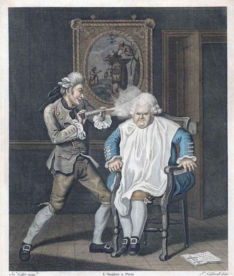 Although eighteenth-century hairstyles often involved white powder, colored powders were also available.2Curiously, some have questioned whether “pink powder” might refer to pigments like Dutch pink, a yellowish hue derived from ripened buckthorn berries. While Dutch pink was commonly used in artistic contexts, particularly for its soft, muted tones, period references to “pink powder” seem to align more consistently with the modern understanding of pink—brighter, more vivacious, and often associated with the fashion-forward circles of the time. This contrast suggests that Dutch pink was probably not the source for the hair powder referred to in fashion and literary references, a conclusion supported by its lack of appearance in recipe books for hair powder or blush during the period. It does not appear, for example, in the recipes for any type of face paint in Pierre-Joseph Buc’hoz, The Toilet of Flora: Or, a Collection of the Most Simple and Approved Methods of Preparing Baths, Essences, Pomatums, Powders, Perfumes, and Sweet-Scented Waters, With Receipts for Cosmetics of Every Kind. . . . rev. ed. (London: J. Murray and W. Nicoll, 1784). For Dutch pink’s applications in painting, see n. 25. For example, a 1778 advertisement by the Bath perfumer Berwick lists shades such as poudre-maréchale (a reddish-brown powder also called French Rose Maréchale), violet, brown, pink, gray, and white.3“Berwick of London,” Bath Chronicle, January 1, 1778. As a selling point, the advertisement signals that many of the items for sale have “just arrived from abroad.” While colored powder was strongly associated with French tastes—particularly the fashion influence of Madame de Pompadour, mistress to King Louis XV;4See, for example, François Boucher, Pompadour at Her Toilette, 1750, with later additions, oil on canvas, 31 15/16 x 25 9/16 in. (81.2 x 64.9 cm), Harvard Art Museums/Fogg Museum, Cambridge, MA, 1966.47, https://hvrd.art/o/303561. The painting is a vivid celebration of pink, reflecting its connection to both cosmetics and high fashion. Marie Antoinette, queen to Louis XVI;5Marie Antoinette was also strongly associated with colored hair powder. Period accounts note that she wore Rose Maréchale powder, which perfumers touted as heightening the complexion. See [George Smith and William Makepeace Thackeray, eds.], “Paint, Powder, and Patches,” Cornhill Magazine 7 (June 1863): 739. and the aristocratic subculture of post-Revolutionary France (Fig. 5)—its appeal extended to English elites. The Whig: Initially forming in England as a political faction and then as a party, Whigs supported a parliamentary system and espoused ideals of liberalism and economic protectionism. Their opposing party were the Tories. politician Charles James Fox, who sported blue hair powder, red heels, and a French accent after returning from abroad, drew both admiration and criticism for his embrace of French fashion, underscoring the period’s complex relationship with imported styles.6While Fox eventually stopped wearing blue hair powder, the color became associated with his Whig party politics; see Philopatris Varvicensis [Samuel Parr], Characters of the Late Charles James Fox (London: J. Mawman and Poultry, 1809), 1:111. Georgiana, Duchess of Devonshire, criticized his display and affectation of French fashions as unpatriotic; see Georgiana Spencer Cavendish, The Sylph: A Novel, ed. Jonathan Gross (1779; repr. Evanston, IL: Northwestern University Press, 2007), xix.