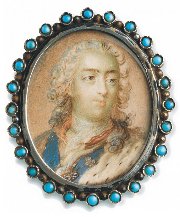 These pigment instabilities potentially impacted Smart’s miniatures and are also observed in other artists’ works. For example, a portrait of a man by Peter Paillou (English, 1757–1831) depicts green hair, possibly the result of burnt umber shifting to green over time (Fig. 10). Similarly, a miniature of Louis XV in the style of Jean-Baptise Massé (French, 1687–1767) provides clear evidence of unstable blue pigments in the hair and sky, both of which have turned pink (Fig. 11).29My thanks to Bernd Pappe for sharing this example. These examples suggest that pigment alteration might explain some of the pink and lilac tints present in Smart’s sitters’ hair.