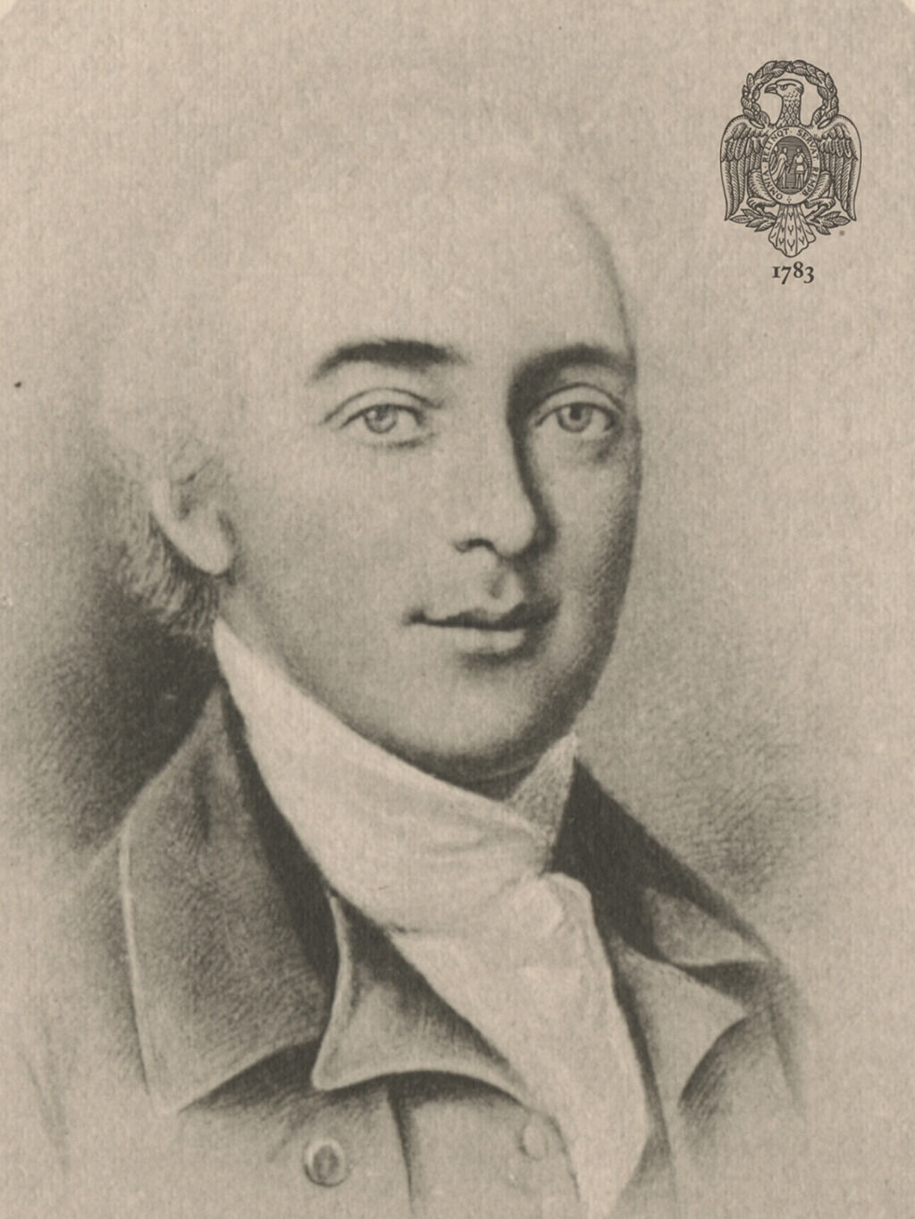 Peale’s characteristic late style, distinguished by meticulously rendered features and fashions, solid modeling, and deep jewel tones—as opposed to the lighter palette and airy handling of media by English miniaturists like Richard Cosway—may have appealed to Nichols, who did not suffer fools.5Nichols had a fiery temper, and in September 1782 he was tried and convicted of assault and battery against a gentleman named Joseph Gardner. Nichols was fined fifty pounds. John Dwight Kilbourne, Virtutis Praemium: The Men who Founded the State Society of Cincinnati of Pennsylvania (Rockport, ME: Picton Press, 1998), 1:731. Nichols’s bright blue eyes, framed by dark, thick brows, and his wry smile convey a confident man who considered himself a worthy subject for Peale, who was highly fêted for the series of full-length portraits of General George Washington that he began in 1779 (the original portrait is at the Pennsylvania Academy of the Fine Arts). A print of Nichols was likely made after the Peale miniature and was possibly commissioned by the nascent Society of Cincinnati, formed by a group of officers from the Continental Army to ensure their financial, fraternal, and patriotic rights (Fig. 1).6For more on the Society of Cincinnati and its formation, see Edwin A. Hoey, “A ‘New and Strange Order of Men,’” American Heritage 19, no. 5 (August 1968), https://www.americanheritage.com/new-and-strange-order-men. Nichols was a founding member. The print bears a stamp at the upper right corner with the society’s motto, “Omni Relinot Servat RempB,” an abbreviation for Omnia Relinquit Servare Rem Publicam, or “He gave up everything to serve his country.” The date 1783 appears underneath, signaling the end of the war and the latest possible date for the miniature. Although the print is very similar to the Peale miniature, Nichols’s head appears without the slight tilt, and he meets our gaze directly. Although Nichols never married, he fathered two children with two different women, so perhaps the miniature was not only to remember him but to commemorate his visage for future generations.7Major Nichols’s marital history is unclear: one source gives his wife’s name as Elizabeth Stimbing, or Stemberg. She evidently predeceased the Major, as no wife is named in his will. His two daughters were born in Pottstown: Anna Maria, whose mother remains unknown, born about 1795; and Harriet, born about 1804, whose mother was Nichols’s housekeeper, Esther Parker. Both girls lived with their father, and he acknowledged them in his will. See “Revolutionary War Hero Makes his Mark and Home in Pottstown”; see also Kilbourne, Virtutis Praemium, 728–33.